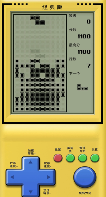 提供了7种不同型块的模块,界面上没有多余的元素,也不会出现乱七八糟的内容影响体验。整体画面采用了复古的像素风格,再加上熟悉的背景音乐,很容易让人想起时候经典的游戏的时光。随着关卡不断推进,模块下落的速度也会越来越快,一开始还能轻松应对,到后面就必须要集中全部注意力才能跟上节奏,紧张感会慢慢出现。