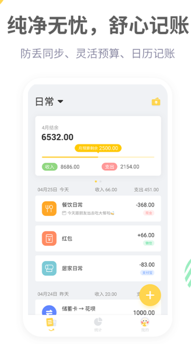 强调记账过程的仪式感与审美体验。采用纵向时间轴布局,每笔收支以卡片形式依序排列,配合微交互动画增强浏览流畅度。快拍识图支持模糊票据识别,智能归类准确率达92%以上。支持多账本隔离管理,如“家庭共享”“毕业旅行”“副业收入”,各账本独立设置预算与提醒规则。当月度支出突破阈值时,“小狐狸助手”会变更表情状态予以提示;梦想储蓄罐功能允许设定目标金额与达成周期,自动计算日均需存数额及进度百分比。