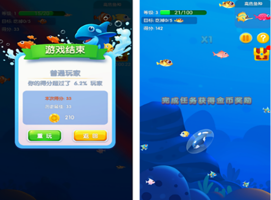 这款以大鱼吃小鱼为主要玩法的手游,也将化身为一只小虎鲸鱼,在面对饥饿,甚至是不断进化的过程当中,需要吃比自己体型小的鱼,然后还要注意躲避比自己体型大的鱼儿。通过这一种方式,既能够完成成长,成为水中的巨无霸,游戏还能够帮助玩家通过成长的方式,获得金币以及分数,兑换各种装饰品以及水族馆中的鱼儿。