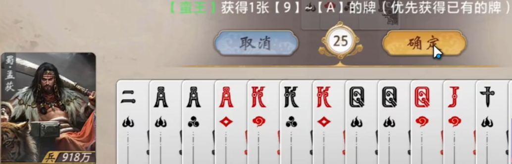 在《三国百将牌》这款策略卡牌游戏中,孟获作为南蛮王,凭借其独树一帜的技能机制成为高辨识度武将之一。其核心能力围绕“压制响应”与“阶段转化”两大逻辑展开:每当玩家打出的牌被其他玩家成功压制时,立即获得一张点数为9、10、J、Q、K或A的补牌,单局内该效果最多触发七次;当第七次触发完成后,可将当前手牌中点数最大的三张牌(按牌面数值计算,A为最大)赠予任意一名玩家。