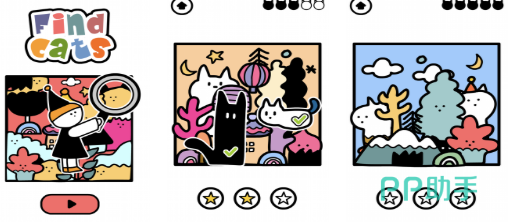 本作采用高度抽象化的手绘漫画风格,核心玩法聚焦于“视觉搜索”——每关随机配置不同数量的小猫藏匿于复杂构图场景中,玩家需在限定时间内完成全部定位。系统提供三次容错机会,显著降低挫败感;画面用色大胆、线条简练,猫角色设计兼具识别性与趣味性,适合偏好快节奏轻解谜的用户。