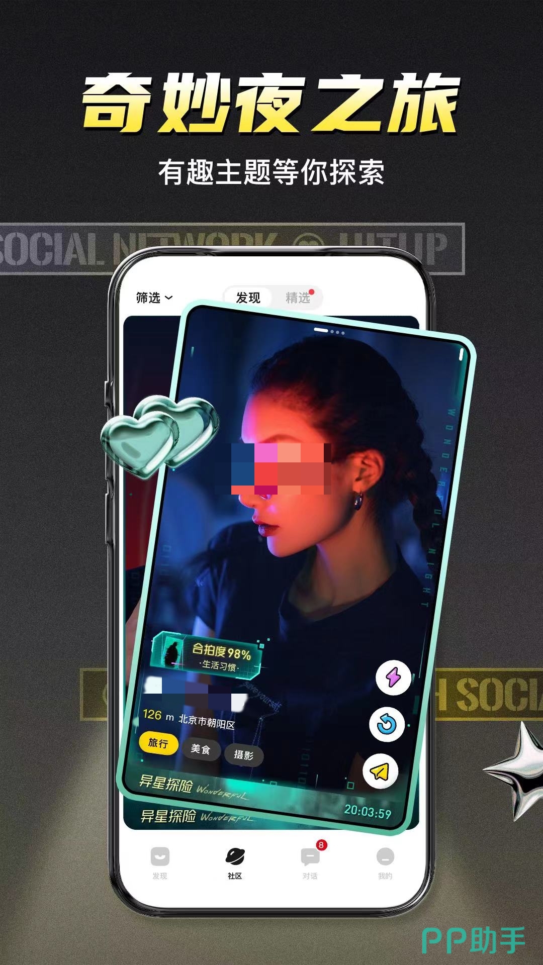 融合兴趣社交与线下联动机制。核心交互采用卡片滑动匹配,匹配成功后可围绕音乐、旅行、摄影等标签展开对话。特色功能“奇妙夜”每周限时开放,营造角色扮演氛围;平台同步聚合同城活动信息,如Livehouse拼场、小型音乐节等,支持一键报名参与。