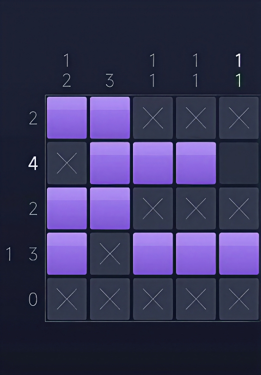 每局开始时,玩家面对的是一个全白网格,而横向与纵向的行列边缘会标注一组数字线索。这些数字并非随机排列,而是精确指示该行或该列中所有连续涂色区块的长度(单位:格子数),且各区块之间至少间隔一格空白。例如,“3 2”表示该行列存在两段涂色区域,前段长3格、后段长2格,中间至少空1格。玩家需结合行列交叉信息,逐步推导出唯一解。上千个精心设计的关卡,覆盖从入门到高阶的完整难度梯度,确保不同水平的用户都能获得清晰的成长路径与持续的挑战动力。
