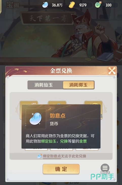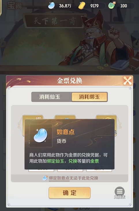如意点也有绑定和非绑定的区别,其中能与绑定仙玉一起使用来兑换成金票的为非绑定如意点,非绑定如意点目前所能获取的方法为抽取天官赐福,每抽取一次就能拿到180的非绑定如意点。当然,并不是说绑定如意点就不能换成金票,只是它不能用来直接兑换,得需要玩家们先去寄售通宝,卖出后可消耗绑定如意点将获得的绑定仙玉变成金票,以此来完成金票的获取,在操作上要比直接用非绑定如意点去兑换复杂一些。