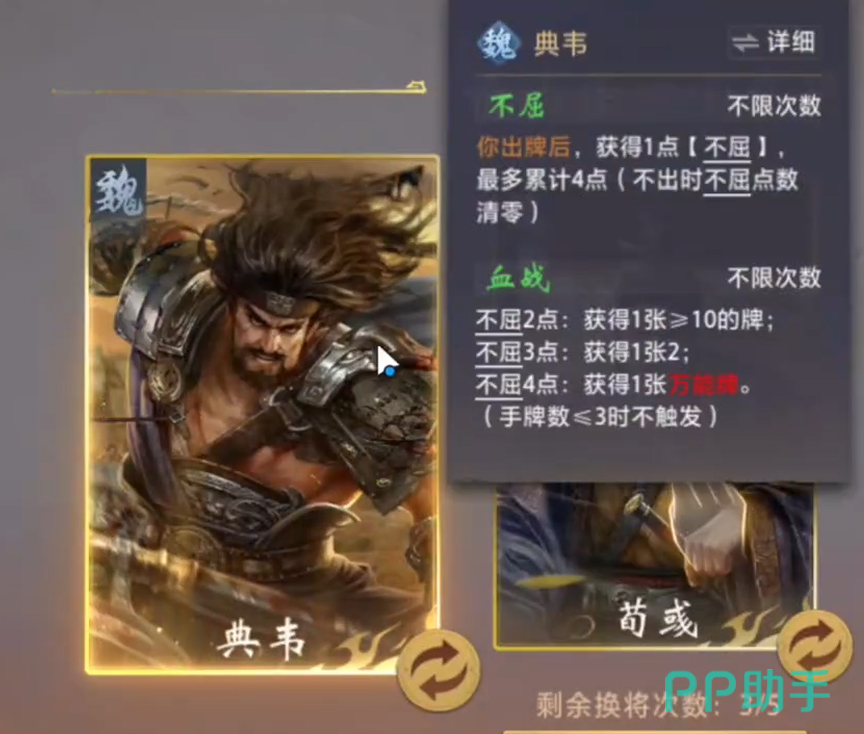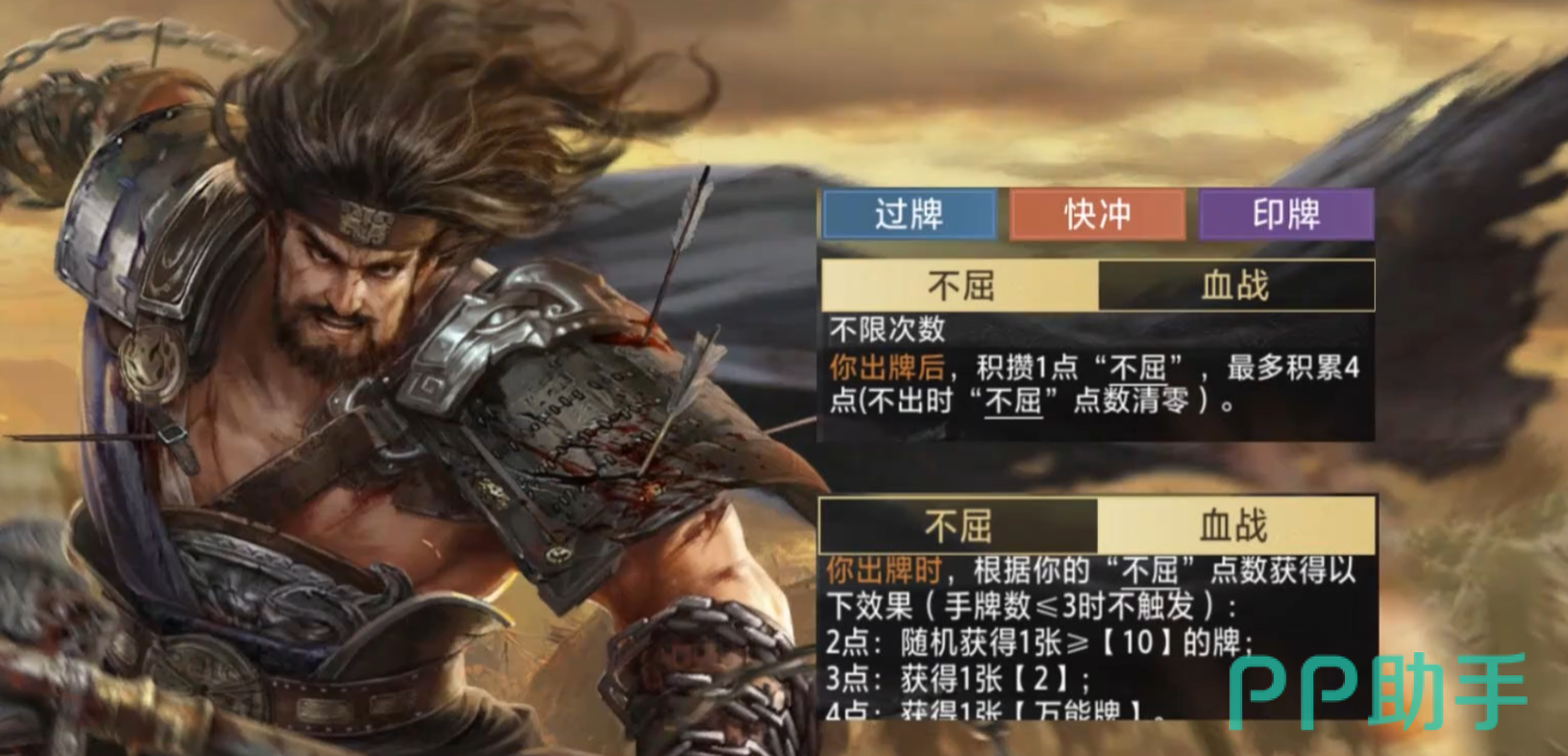 当不屈点数不断增加的时候,“血战”就会被激活。血战会根据当前的不屈点数给玩家提供不同的奖励,在手牌数量少于或者等于3张的时候,血战的效果就不会被触发,这也要求玩家在出牌的过程中合理地控制手牌的数量。当积累到2点不屈的时候,典韦会随机获得一张点数大于等于10的牌,在对局中常常会提高关键牌出现的概率,给后面出牌提供更多的选择。