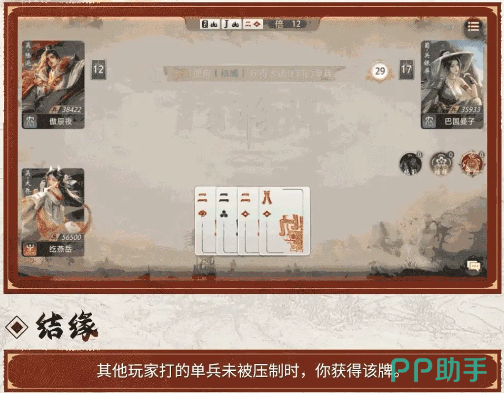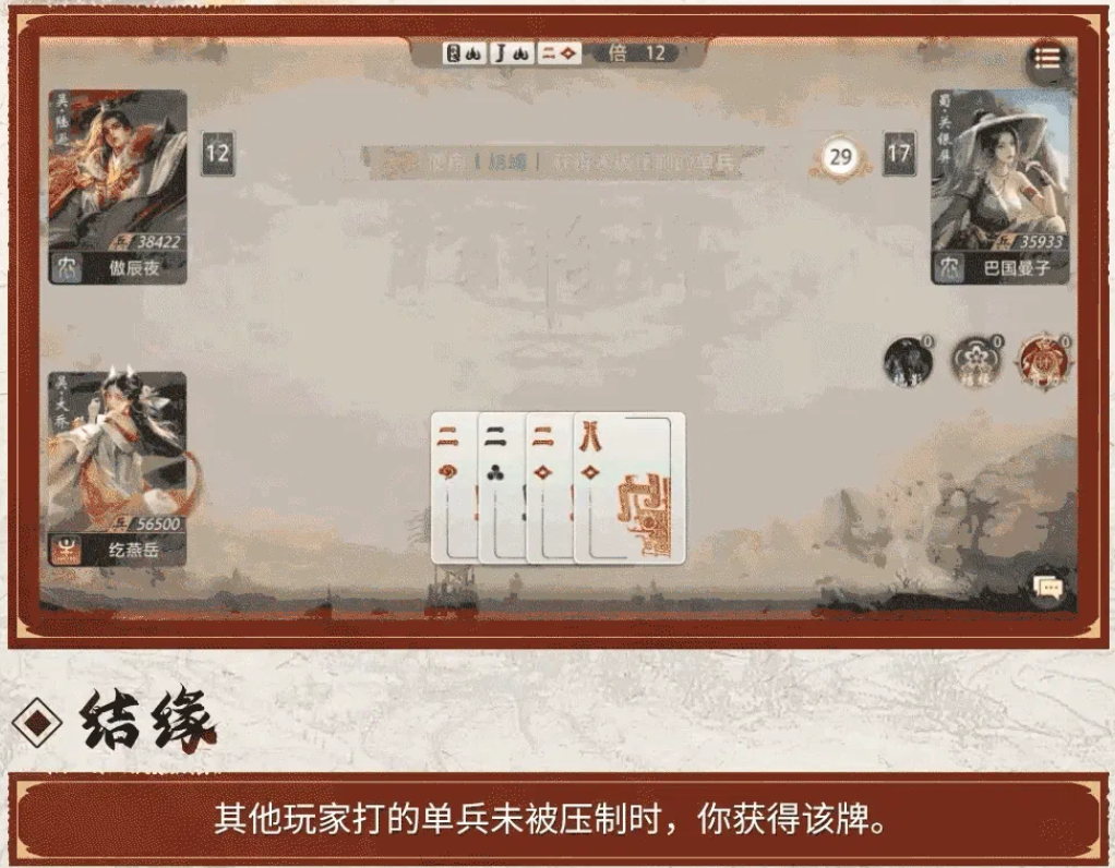 大乔的第一个核心能力结缘就是获得无人压制的单牌。当其他玩家打出的单牌在一轮出牌中没有人再压制它的时候,大乔就会得到这张牌。看似简单,但是在实际的对局中价值却非常大。很多玩家在处理单牌的时候都会选择大点数的A或者2,一旦这些牌没有人再继续压制的话,就会被大乔拿走。随着局的推进,大乔可以通过这种方式慢慢增加自己的高点数牌,使自己的手牌质量不断提升,同时也会间接影响对手随意出大牌的行为。