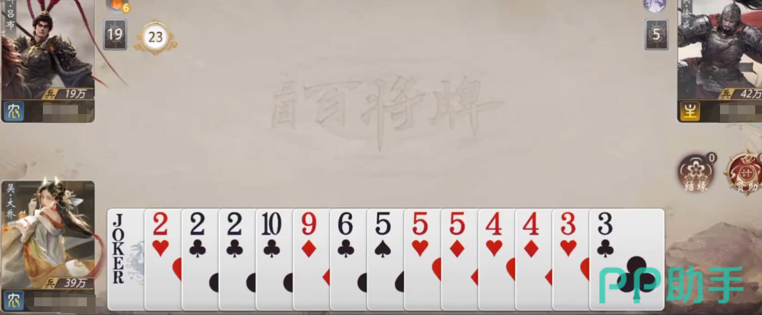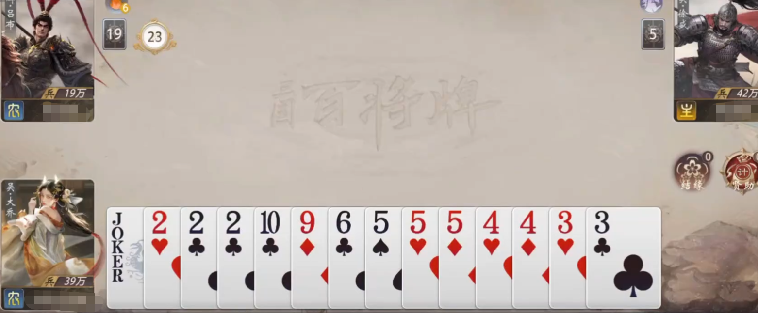 由于角色技能不能缺乏大小王的缺陷,在实战中可以利用这一点来做出判断。例如某位玩家显示出了最大的牌,但是没有补上大王和小王,那么大小王就还在其他玩家手中。大乔既可以补充手牌,也可以间接获取牌局信息,从而为以后的决策提供依据。了解了这些之后,大乔选择出牌的底气就更大了,队友也更容易躲开对手的强牌,比赛的节奏也渐渐被大乔把握住。