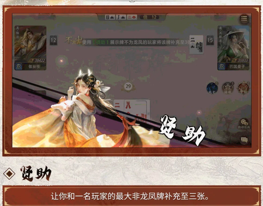 大乔除了单牌外还有一个非常重要的辅助技能【贤助】。她可以挑选一个玩家,自己拿一张牌,对方拿一张牌,然后双方各补一张牌。但是该技能存在一个限制,就是不能补充王牌。该设计使技能既有补牌的功能又有战术信息的价值。如果队友最大的牌比较小,大乔就会帮助他补充更多的高点数牌,使队友在后面回合有更好的出牌条件。