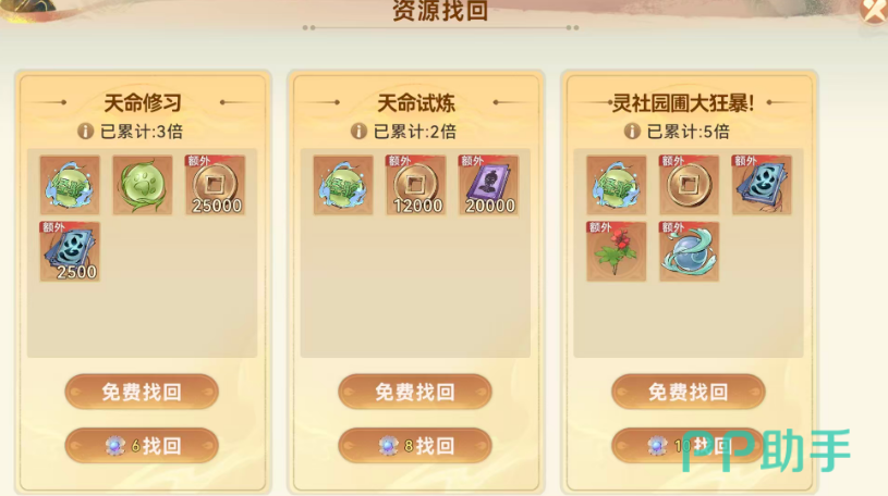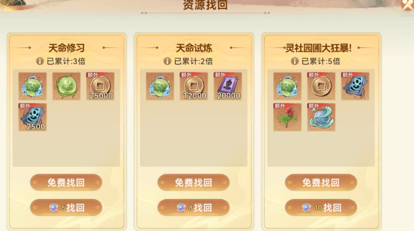 包括天命研习册此类消耗量比较大的物品都是大家可以通过这里的镇压奖励来直接获取,而且每一个小时大家领取了之后,可以通过上面不同的领取时间来看,自己累计可以拿到什么样的道具,除此之外,游戏当中左上角还有一个资源找回,其实跟这里的挂机系统也是有关联的,因为在资源找回系统当中,大家可以选择免费找回之前没有参与的前一天的一些限时活动当中的奖励,比如说天命试炼、大狂暴这些限时活动都是会给大家提供一些比较珍贵的资源奖励,所以大家在这里如果想要累积拿到更多资源的话,通过这个系统可以在这里难道免费找回的相应资源,这些资源当中同样也包括了大部分的经验数值。