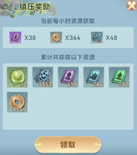 游戏当中的挂机系统就是这里的镇压奖励,一般会出现在左上角的镇压奖励当中,大家每一个小时都可以直接领取其中的各种资源,这里基础的资源当中有各种升级修为需要消耗的道具,也有货币,其中还有角色升级必备的一些材料,所以这里按到的资源大家后期用处也比较多,除此之外,大家还可以在挂机时间比较久的时候再获取一些其他消耗资源比较多的资源,比如说前期大家升级要用到的经验,在这里就是初级领悟丹,大家通过这里的挂机也是可以同样领取到的。