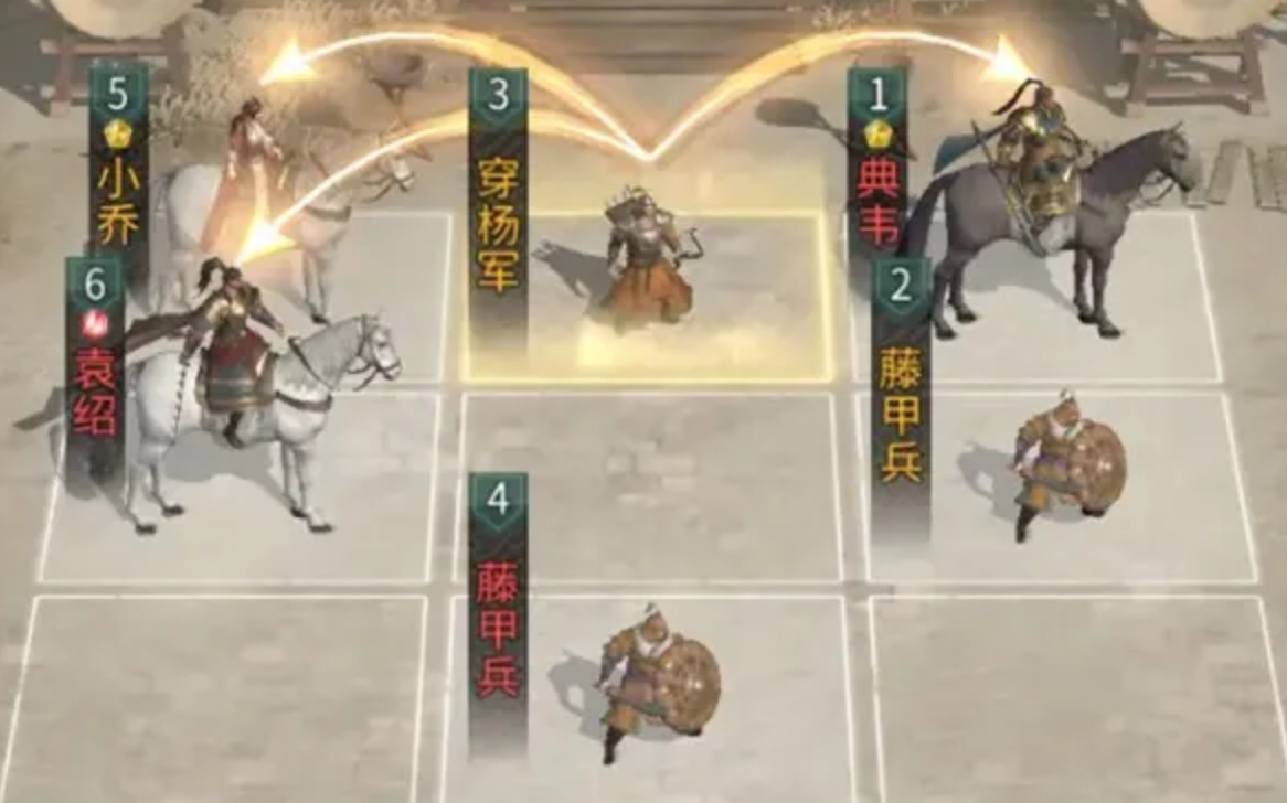 典韦一般放在右上最前面,是主坦,保证前排稳定和生存。他的天赋【折冲左右】可以给追击格上的单位提供格挡,随机挑衅两名敌方单位,为穿杨军创造输出环境。小乔、袁绍在穿杨军后方,起辅助、分担输出的作用,小乔的【琴瑟和鸣】可以给穿杨军的兵力最低的三个单位提供护盾和伤害减免,大大提高了生存能力,也保证了穿杨军的持续输出,使整个阵容更加均衡。