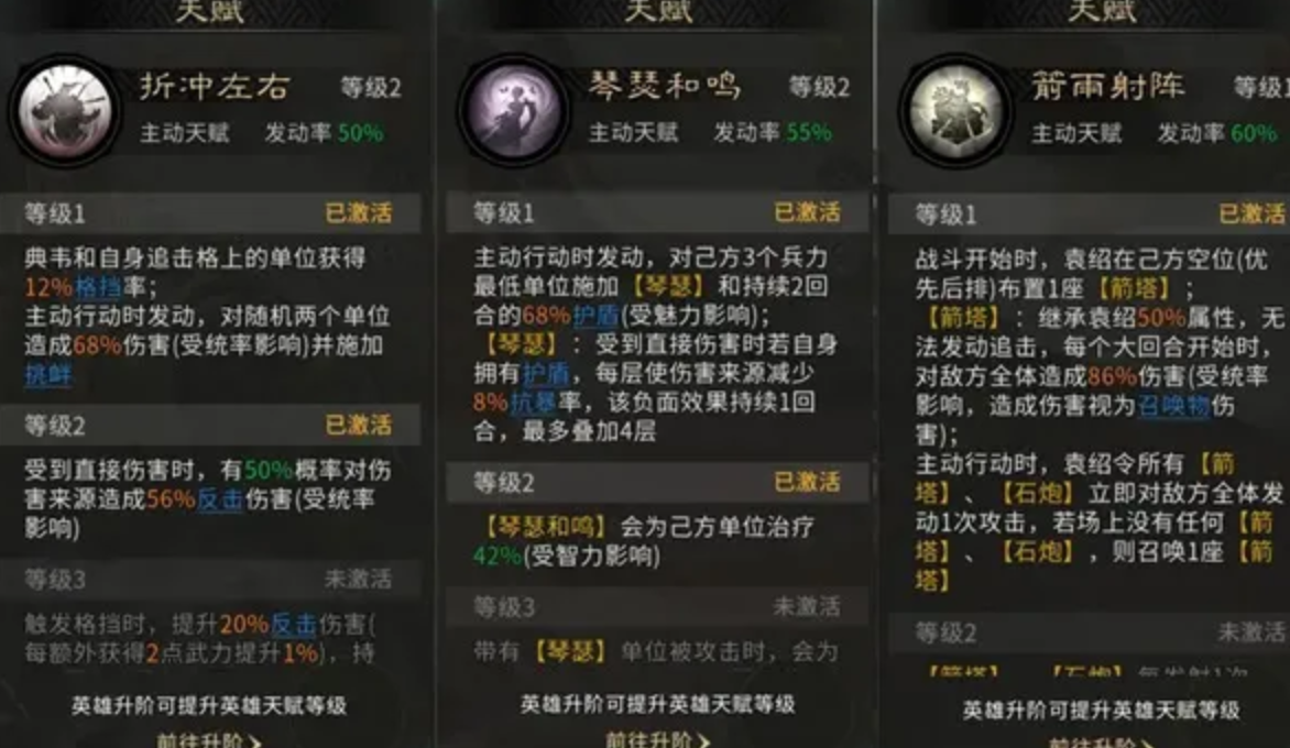 典韦主动携带【历战之躯】、被动【一夫当关】,提高前排坦度、控制敌方攻击方向。小乔的主动、被动技能都带【厉兵秣马】,给自身和追击格单位提供护盾和伤害减免,使穿杨军可以输出。袁绍推荐携带【深仁厚泽】,回血的同时可以提高自身的统率属性,分担敌方的输出,使用【一夫当关】增加防御。各个特色明显的技巧组合起来就是一套完整的战术系统,保证了队伍一直处在稳定高效的运转之中。