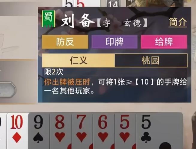 当刘备手中抽到高点数或者成型牌型的时候,就可以用仁义把重要的卡片传给攻击型或者控制型的武将,进而掌握场面的节奏。不但可以加强阵容的连贯性,在对手压制或者出牌不利的时候,用精准的送牌来实现逆转。合理技能释放可以让队伍持续占据优势,在团队里价值大大高于单支援的角色,刘备的存在可以左右整个战局的结果。多人对局中刘备的送牌策略十分重要,可以最大限度地发挥出整个队伍的协作优势。