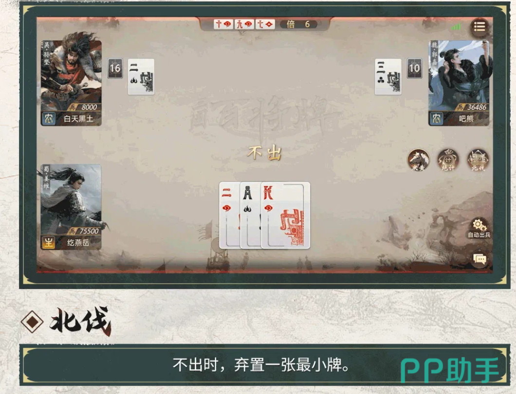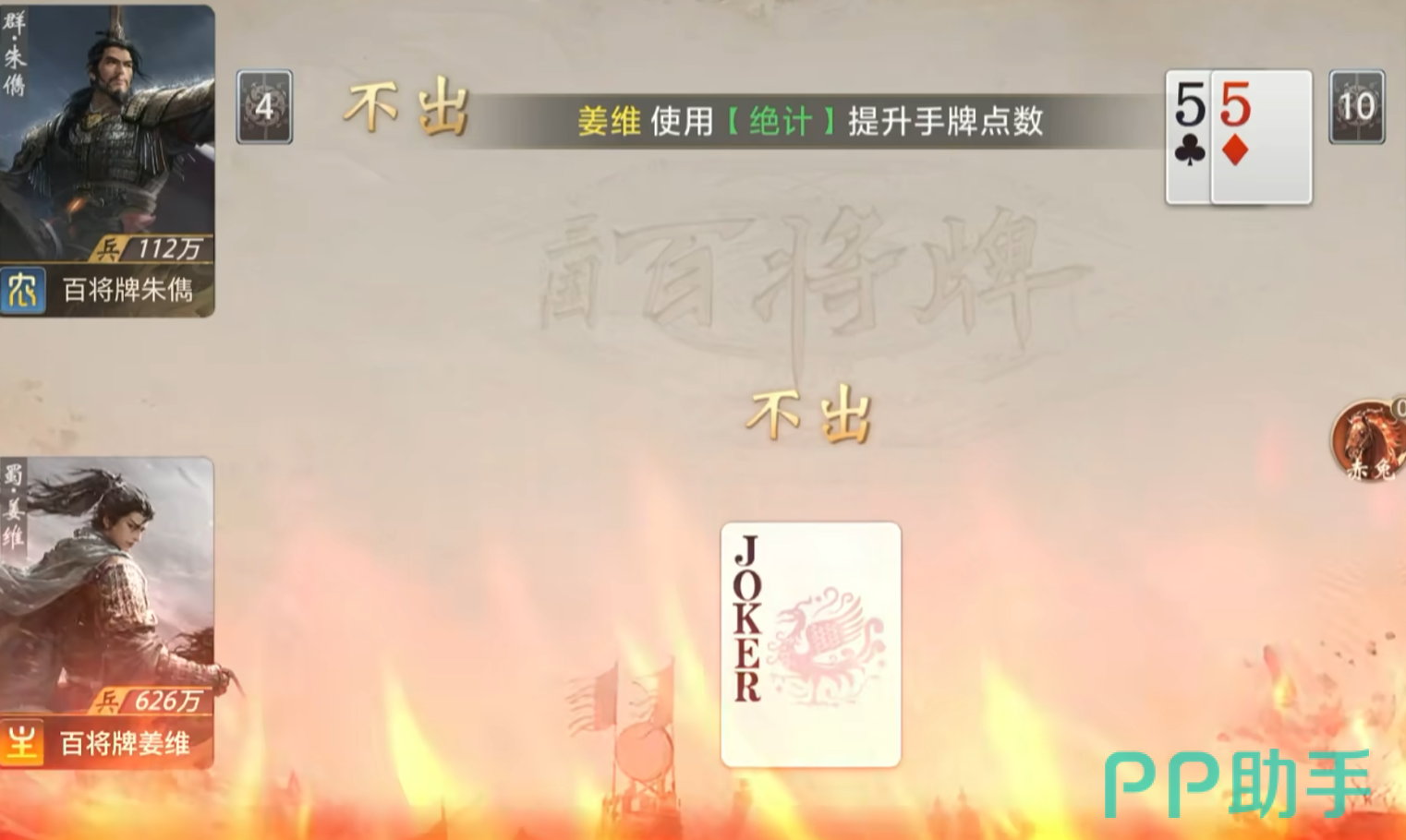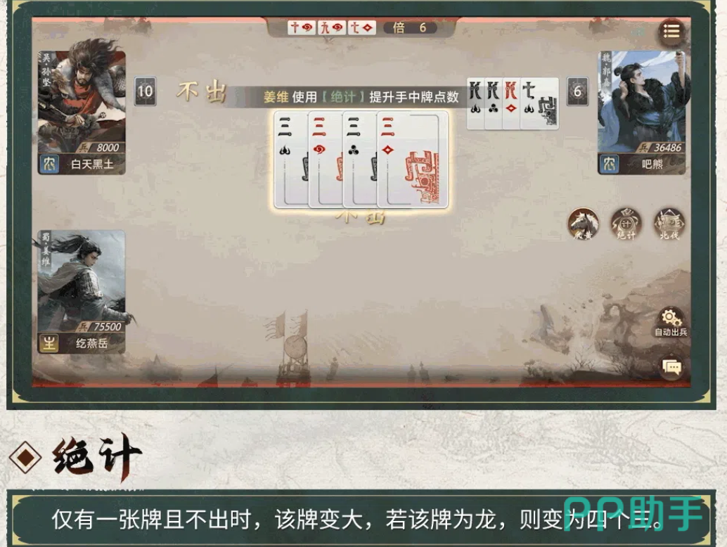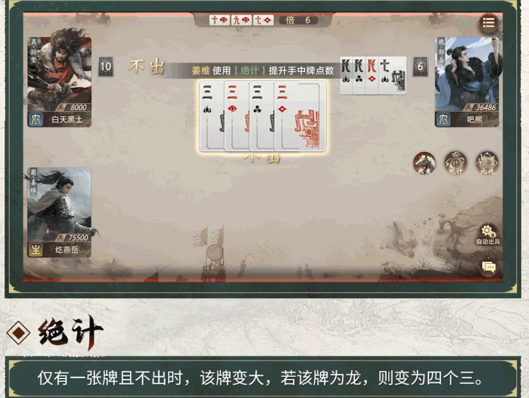 姜维的核心技能可以分为两大部分。其一就是“北伐”,当轮到姜维压牌的时候,如果选择不压,就会自动弃置手中点数最小的牌,直到只剩一张手牌为止。该机制可以迅速减少手牌的数量,给后面技能的使用创造条件。第二是绝计,当姜维手中的牌只剩一张并且不压牌的时候,这张牌会随机变大,如果是大王的话就会变成四张3点牌。变牌效果非常强烈,对手在最后阶段不得不考虑可能的逆转,心理压力大、操作难。