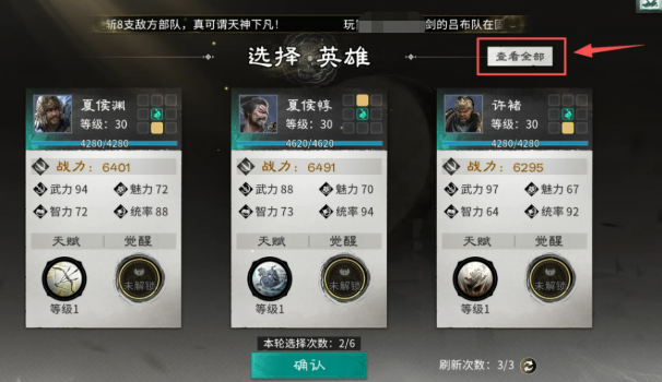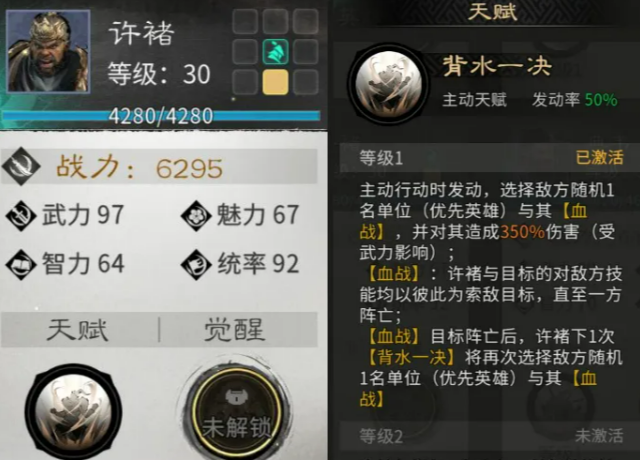 英雄选择这里,建议一个输出一个肉盾的搭配。最好用的组合是许诸配典韦。许诸的天赋技能伤害很高,而且有个血战效果,就是他和目标会一直互相打到有一个死掉为止。典韦的保护能力很强,能帮许诸在血战的时候活下来把对面干掉。