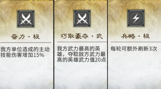 初始效果这块,比较推荐的有3个。第一个是奋力·极,能加15%的主动技能伤害,让英雄打得更疼。第二个是巧取豪夺·武,可以抢对面武力高的英雄20点武力值,前期比较容易建立优势。第三个是兵略·极,每轮多给3次刷新机会,适合后面慢慢凑齐想要的阵容。