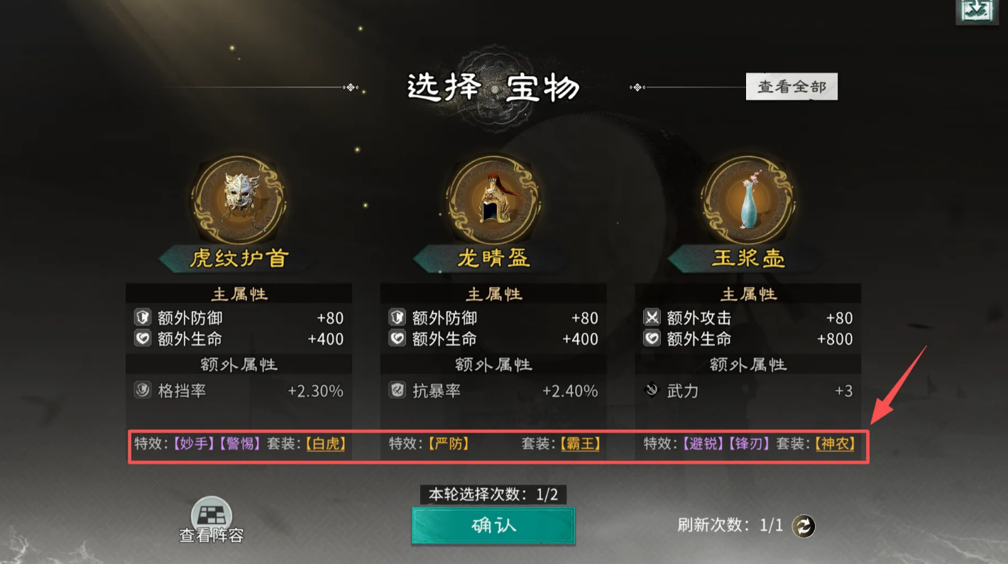后面选宝物的时候,优先凑套装效果,凑不了就选带金色特效的。宝物记得先给输出英雄用。英雄升阶也是一样,先把输出英雄的培养程度提上去,如果开局选了典韦和许诸,就先升许诸。
