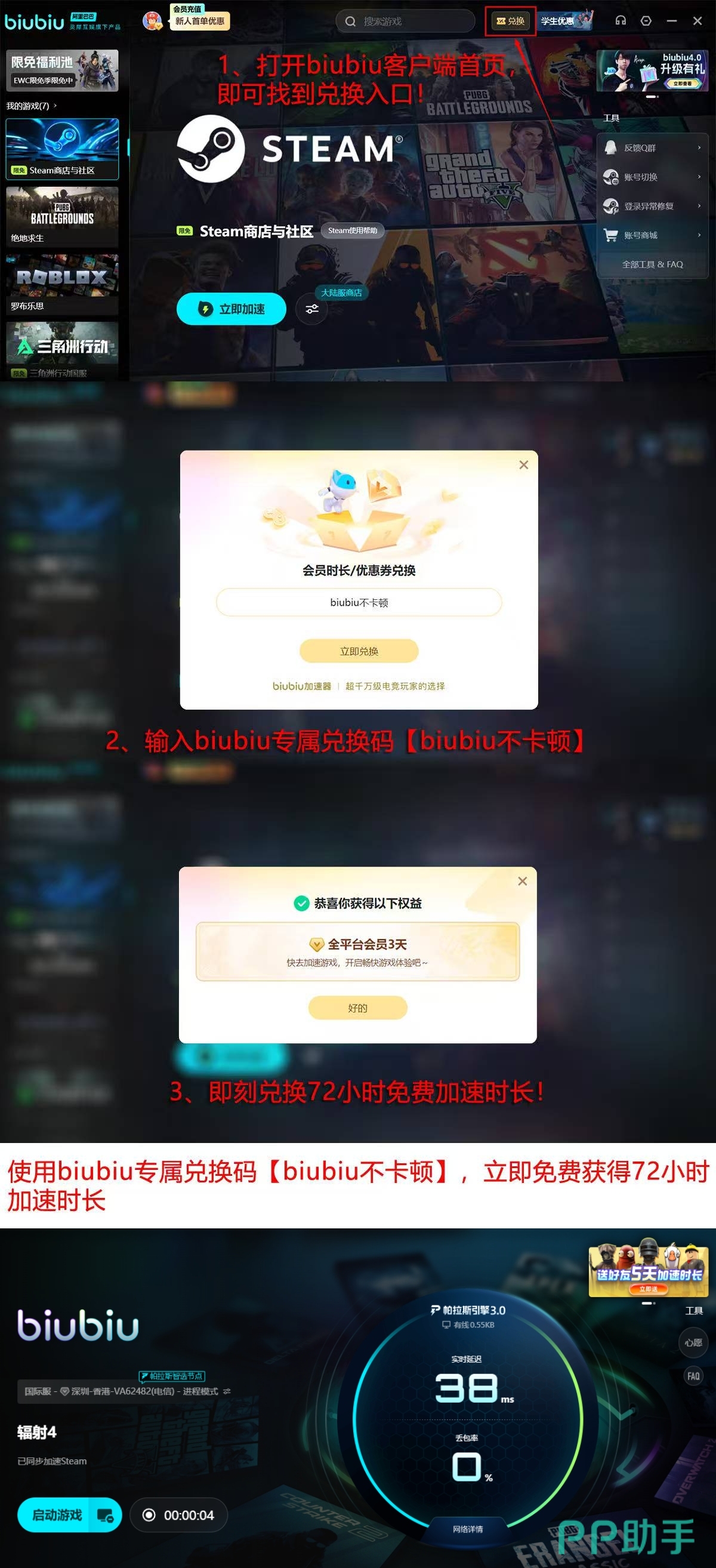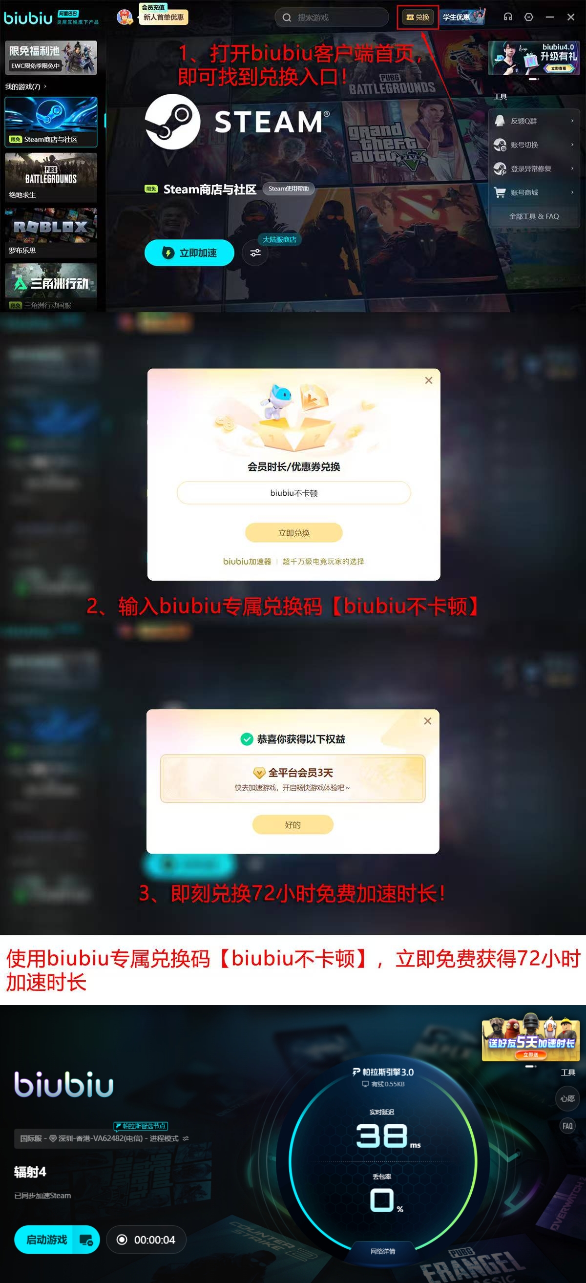 除网络性能外,该工具还集成实用型用户权益体系:【biubiu不卡顿】兑换72小时使用时长活动与新用户注册免费领取24小时使用时间活动并行,叠加后最高可获取最多可以白嫖96小时的使用时长。同时,内置游戏库覆盖市面主流PC及主机平台适配作品,涵盖《耻辱2》在内的数百款需跨境联机或平台认证的游戏,实现“一器多用”的高效支持逻辑。