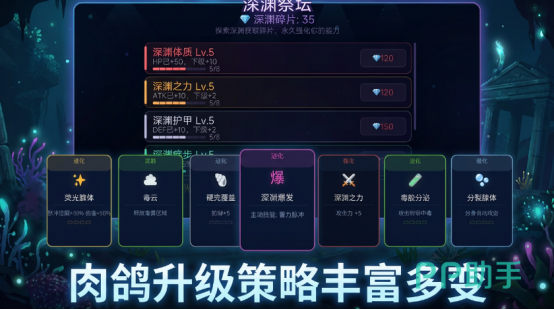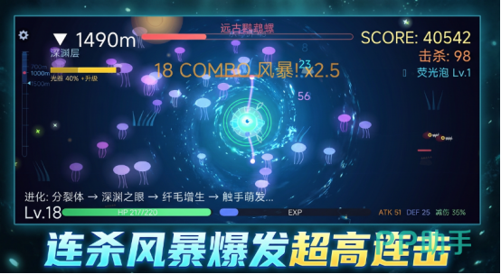 游戏推送出高自由度进化体系,主要的核心模式就是围绕进化展开介绍,最初来到深海当中,你仅是一个单细胞生物,甚至是一个微小的发光体,随着时间推移将开始强化自己的触手,侧重用于高爆发近战控制,然后再增加自己的甲壳增生,这样就能够获得极高的抵抗力,不同的进化路线会改变之后的方向以及具体的外观属性,甚至也能够再次重构战斗逻辑,影响后续的敌方群体配置,确保每次进化都能够获得相当出色的战略意义。