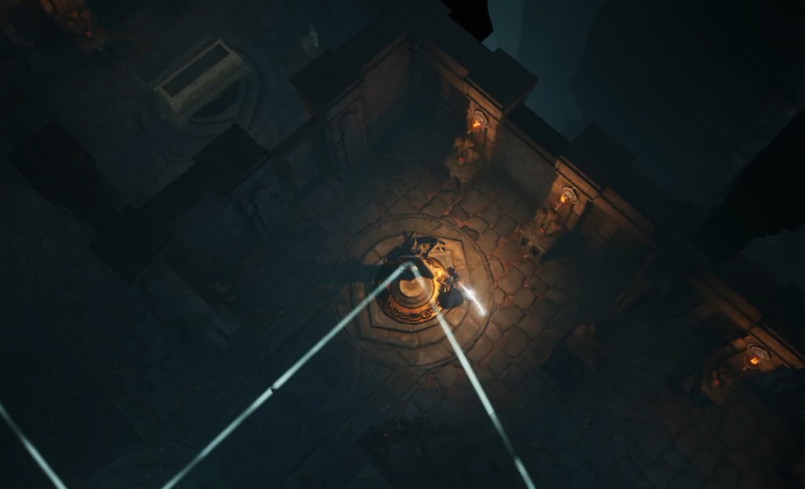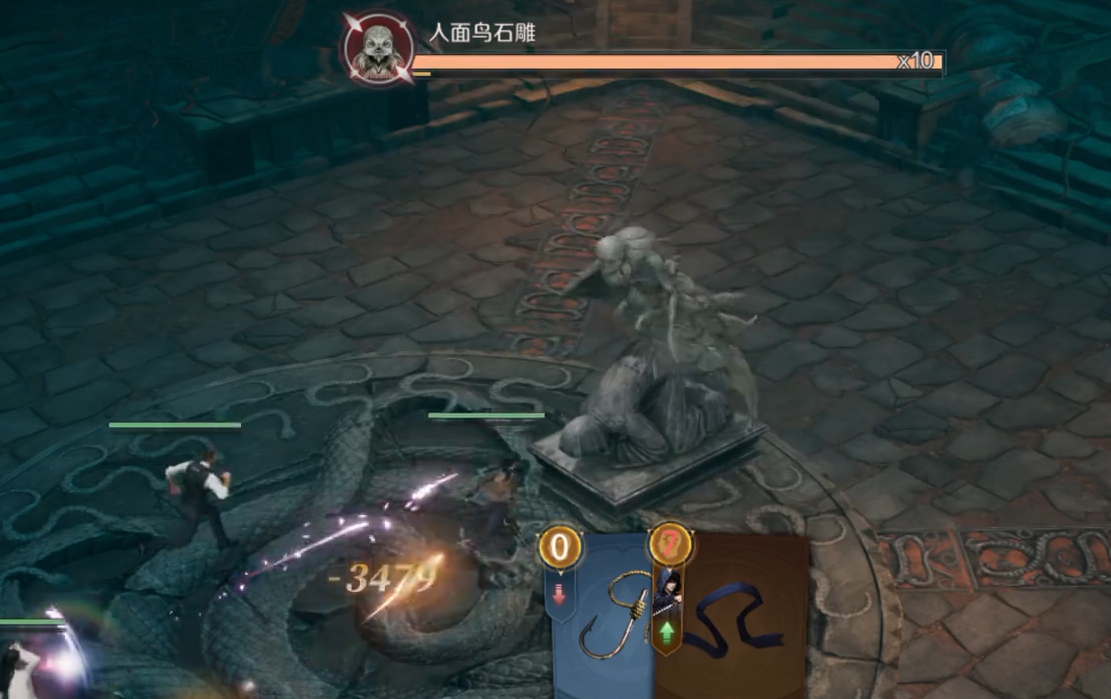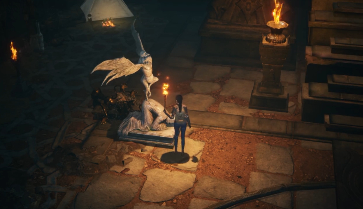 在营地里恢复好后,继续往前来到巨大雕像所在地,在一段剧情后与巨大雕像旁边的四个小雕像交互,将它们都更改成头伏低下来的形态,便能解锁机关继续向前。此时玩家们只要走上高台,与黄金座椅交互,就会进入一段CG剧情,原本的巨大雕像也将活过来与玩家进行战斗。此战难度不是很大,玩家只要注意多留些加血技能在关键时刻使用,那么在角色练度正常的情况下就能较为轻松地解决掉这一个boss。完成战斗后,玩家们便完成了对西王母宫的探索,可在拿完地图里的宝箱后离开。