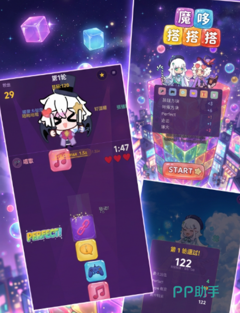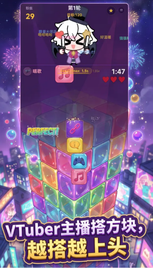 游戏强调策略容错而非手速压榨,新手友好度高。初期建议优先解锁扩容类天赋提升容错空间,稳定建立堆叠节奏后再拓展输出向或特效向流派。所有视觉反馈均围绕“直播现场”设计:方块落定瞬间迸发粒子光效,狂热状态触发全屏动态UI与镜头震动,配合实时变化的背景音乐,完整还原高能直播氛围。