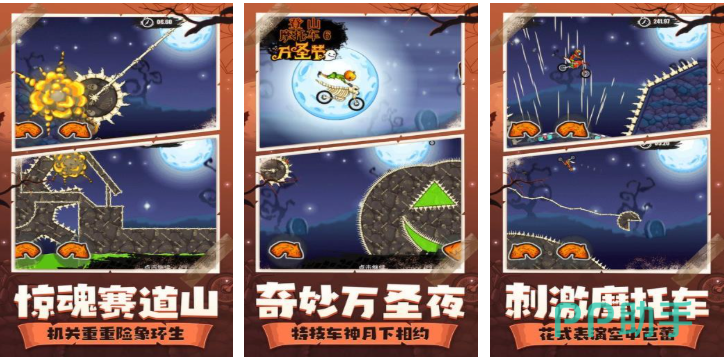 节日限定版本,深度融合万圣节元素:南瓜灯路标、幽灵浮空桥、墓碑障碍群及蝙蝠群干扰机制构成全新赛道生态。车辆涂装加入荧光漆、蛛网纹与动态火焰特效,部分关卡需在限定时间内穿越迷雾区域,考验短时记忆与路线规划能力。物理反馈强化颠簸感与失重感,营造沉浸式惊悚竞速氛围。
