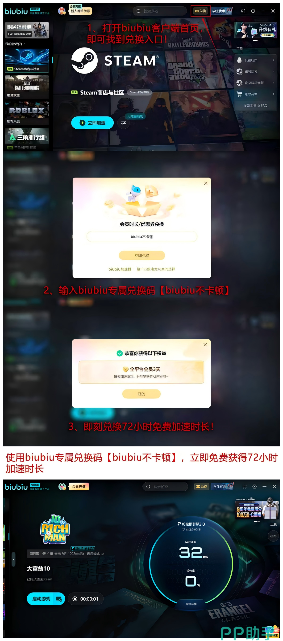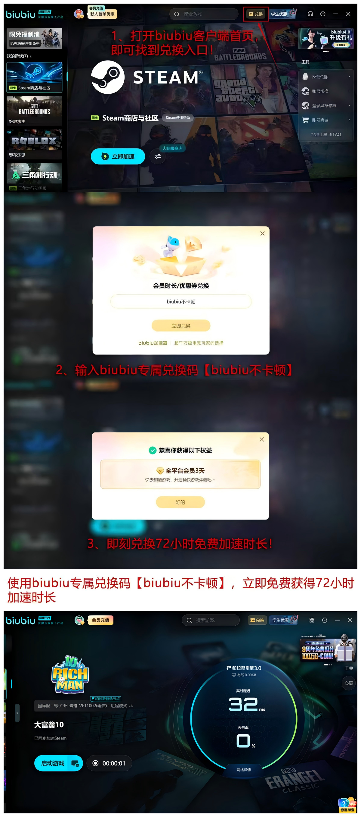 推荐使用【biubiu不卡顿】口令,这个口令可以知道有72小时的时间,加速福利24小时也就是新人的福利也能叠加,96h是大家总计可以获取的时间,主要是为犹豫值不值得购买加速的用户准备,要知道加速为各位带来了非常好的体验,都是根据各位的直观体验获取而来。