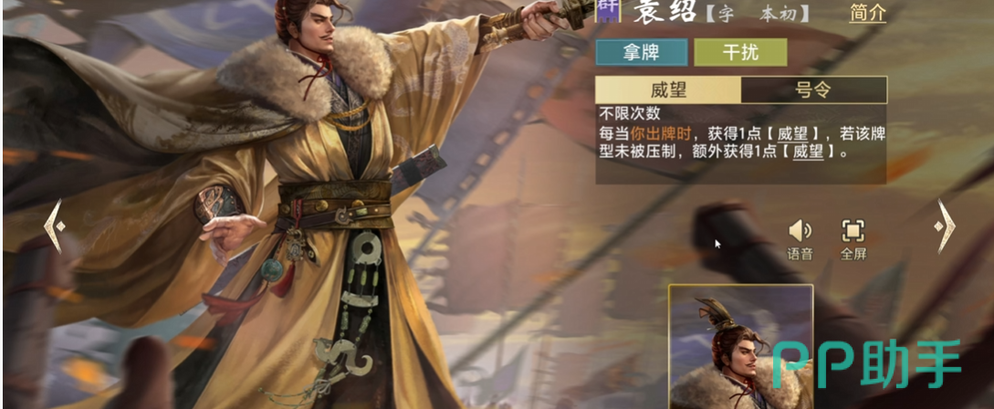 袁绍定位为高干扰性群攻型武将,核心机制围绕“威望”资源构建。一技能【威望】为持续性资源获取手段:每次出牌阶段使用任意合法牌型,即可获得1点威望;若所出牌型未被其他角色压制(即未被更大同类型牌压过),额外再获得1点威望。该技能无发动次数限制,但实际应用需配合二技能协同生效,属策略联动型设计。