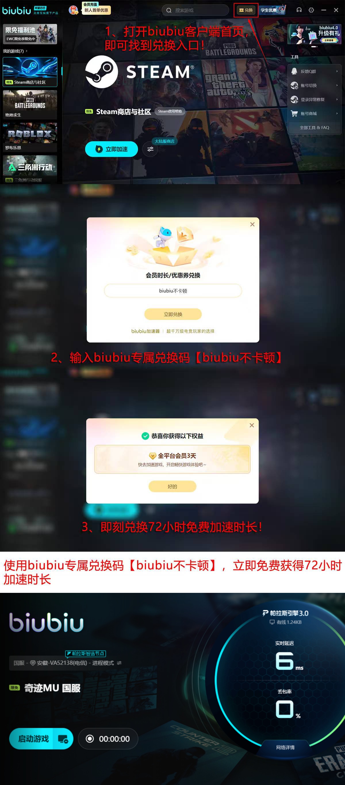 还没有实际体验过的朋友也完全不用担心,biubiu对于新人是非常友好的,不仅界面简洁,只需要输入奇迹mu后,就可以利用一键加速按钮来快速加速,不需要任何复杂操作,而且现在新注册的账号可以得到24小时免费加速时间,使用【biubiu不卡顿】还能额外再获得72个小时,两者可以叠加总共能得到96个小时。