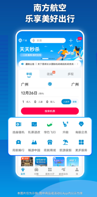 聚焦中短途市场,以高性价比与灵活服务见长。应用界面简洁清晰,主打“特价日历”可视化比价、“盲盒机票”趣味购票等创新功能。支持价格订阅机制,当关注航线出现降价时自动触发通知提醒。行李额度采用分项购买模式,旅客可根据实际出行需求单独选购,兼顾轻装出行与购物返程场景。
