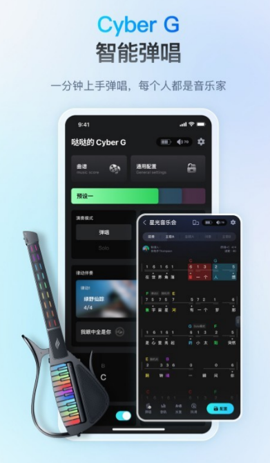 专为恩雅系列智能乐器深度优化,通过低延迟蓝牙协议实现琴体拾音器参数的实时调控。支持吉他拾音模式与麦克风收音模式一键切换,适配不同演奏环境。内置压缩器、混响器、延迟器三类基础效果单元,调节旋钮响应灵敏,参数范围满足日常润色需求。曲谱资源库聚焦尤克里里与吉他两大品类,涵盖热门单曲与经典教学曲目;练习过程中可自由调整播放速度,主音轨与伴奏轨严格同步,确保节奏稳定性。