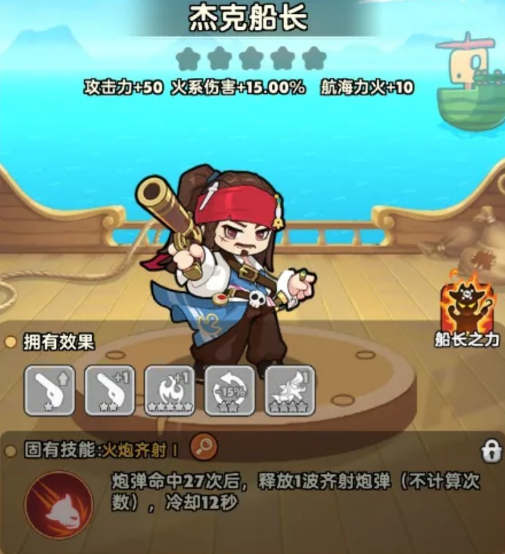 最后的杰克船长放在这里的话,他跟猴子是同样可以给火系能力带来伤害提升的,在这里他的伤害提升可以增加15%的情况下,航海火力也可以增加10点,自身的技能效果当中,他的炮弹只要命中了敌人27次的情况下,就可以释放一次群体的攻击,这个群体的攻击同样也是通过炮弹输出,而且在其中是不会计算他的普攻次数的,这个技能虽然需要连续的时间比较长,但是因为他释放的技能效果就是火炮,所以在输出的速度上面还是比较快的,后期在冷却时间上面12秒时间就可以再一次使用,而他在达到两级之后激活的这个火枪羁绊也是非常好用的,在此时给他搭配的这个整体阵容当中,也要注意他们后期可以激活的羁绊当中会有更多层次可以叠加,比如火枪羁绊就有两层,再增加上重锤以及火系羁绊,还有光系羁绊的话,整体的阵容强度会为船长带来更多的战斗能力。