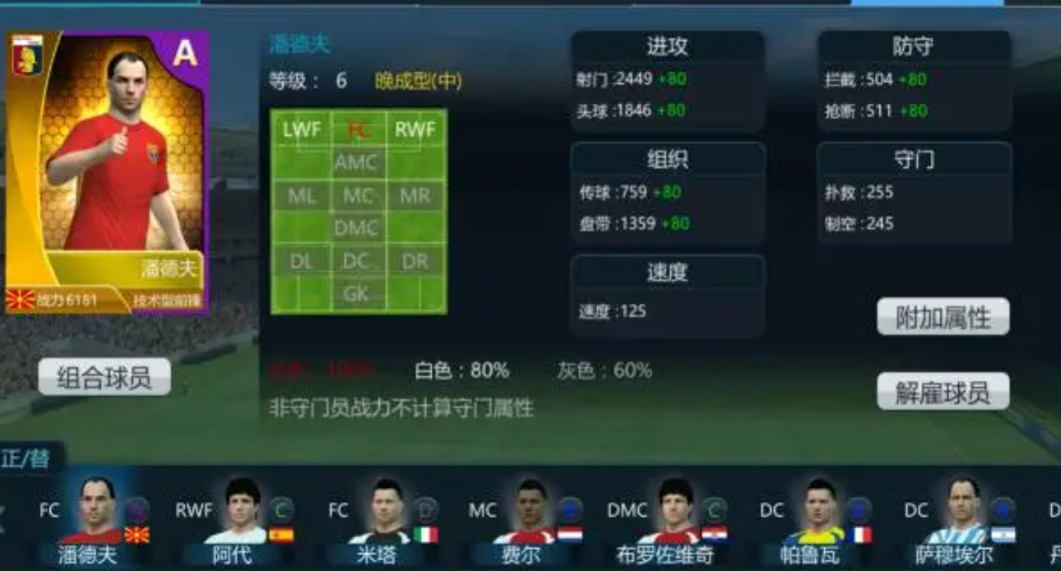阵容适配性上进攻型阵容选择潘德夫(长传冲吊+2-3-1阵型),需要高头球前锋、高传球中场来配合,用空中打击撕破防线。防守反击阵容为安格莱里(全攻全守的3-2-1阵型),重视中场的掌控和稳定的防守,可以促进全能型球员的发挥,用稳定的防守创造反击。推荐以传控渗透和3-1-2为主轴的路易斯恩祈阵容,并且高传球属性的球员短传拉扯起防守节奏,进攻端和防守端都非常合适。