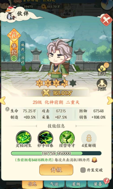 华佗能在战斗中给伙伴提供治疗效果,有着非常强大的治愈能力,妙手回春技能会消耗自身的灵力,为伙伴恢复两倍攻击数值的生命,精英奇才技能会提升自身采集、制造和销售的属性,在打工过程中是非常具有优势,悬壶济世先天气运,在布施药品时有几率提升自身的功德数量,比其他的打工人拥有更多的可玩性,可以在施药时选择使用灵药宝盆法宝,能提升发放的效率,还能增加9%的销售数额,这几个角色互相搭配,能保证玩家在游戏中获取资源的效率。