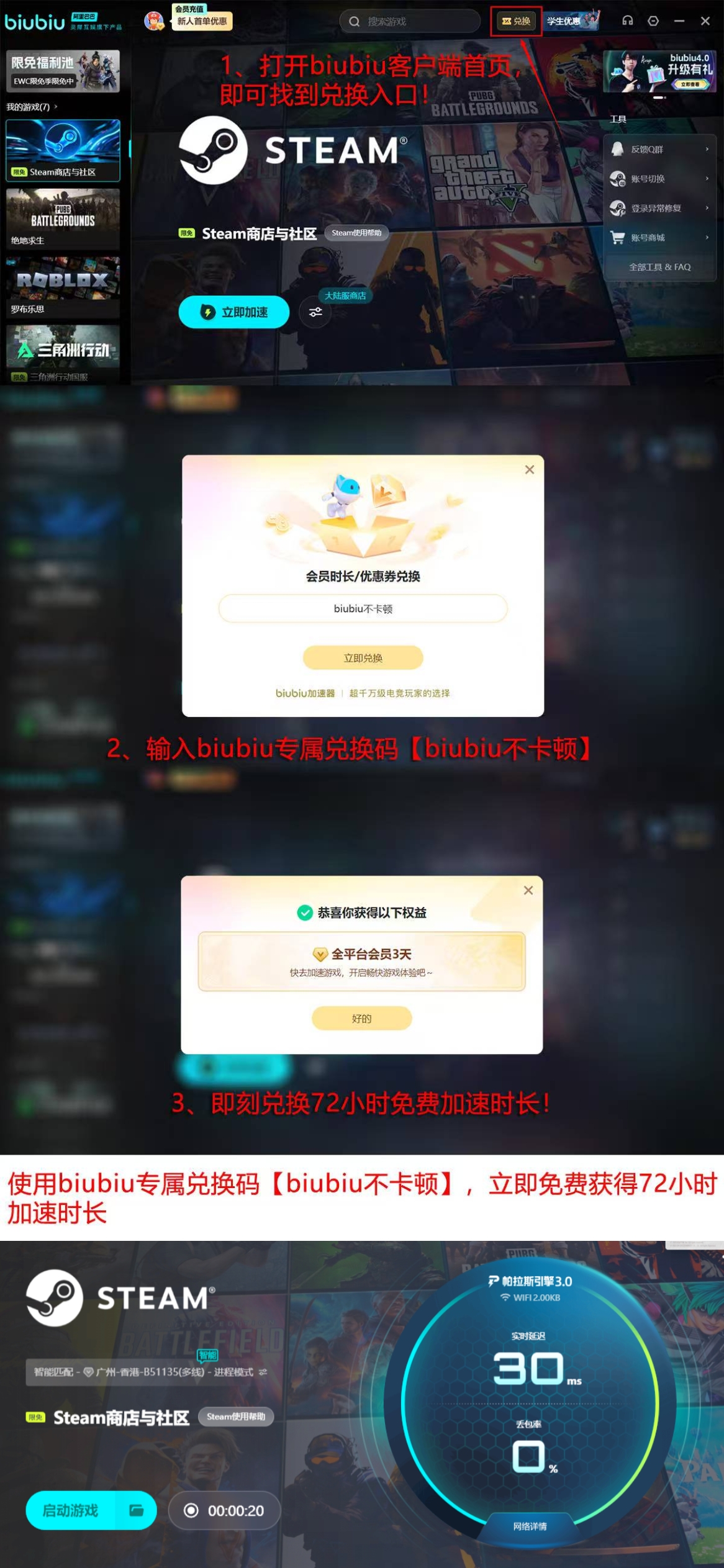 输入激活码【biubiu不卡顿】即可领取72小时高级会员权限;新注册用户自动获赠24小时全功能试用资格,首次启动客户端还将额外赠送96小时连续加速服务。此阶段覆盖完整新手引导、多地图压力测试及跨服对战验证,有助于玩家全面检验本地硬件兼容性、驱动版本适配度及家庭网络出口质量,为长期游玩建立可靠基准。