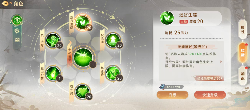 黎幽的核心输出技能“迷谷生蝶”属于中频群攻法术,可对至多3名敌方单位造成89%+160点法术伤害,单次消耗25点法力。该技能具备显著的成长性——随等级提升,除基础伤害增强外,还将额外提高自身生命上限,从而间接强化整体承伤与持续作战能力。当角色等级达到60级时,该技能完成质变,伤害表现与功能性同步跃升,是中后期团队清场与压制的关键手段之一。