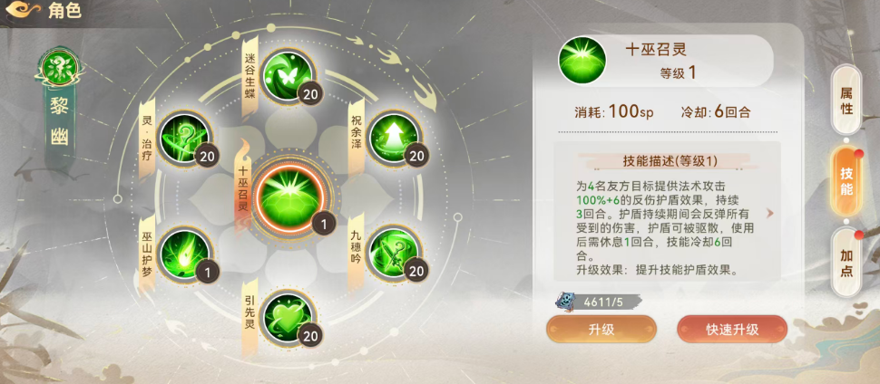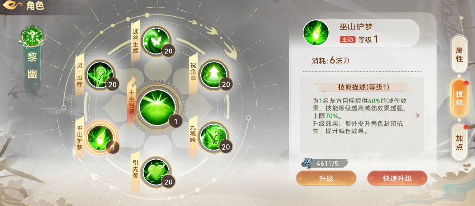 “巫山护梦”是黎幽最具性价比的防御向主动技能,仅需6点法力即可为目标队友施加最高达70%的减伤效果(随技能等级提升逐步增强),冷却时间短、资源消耗低,且升级后还可同步提升封印抗性。建议在战斗开局或关键技能释放前优先使用,为核心输出或脆皮队友构建第一道生存屏障。