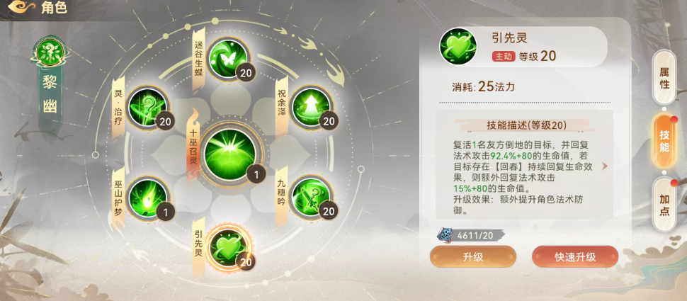 “引先灵”作为黎幽的核心战术技能,具备单体复活功能:可令1名倒地友方单位重返战场,并恢复其法术攻击92.4%+80的生命值;若目标已处于“回春”状态,则额外再恢复法术攻击15%+80的生命值。技能升级后还将附带法术防御加成,进一步提升被复活单位的后续生存能力,是扭转战局的重要底牌。