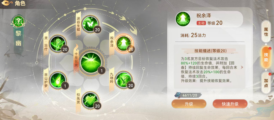 “祝余泽”是黎幽的主力群体治疗技能,可同时为3名友方目标恢复相当于其法术攻击80%+120的生命值,并附加“回春”状态。“回春”效果可持续3回合,在每回合结束时额外恢复法术攻击20%+100的生命值。该技能兼具即时治疗与长效续航双重价值,尤其适合应对中长期拉锯战,累计回复量远超表面数值所呈现的效果。