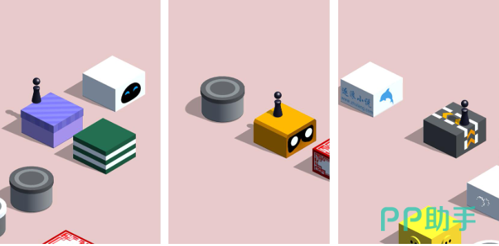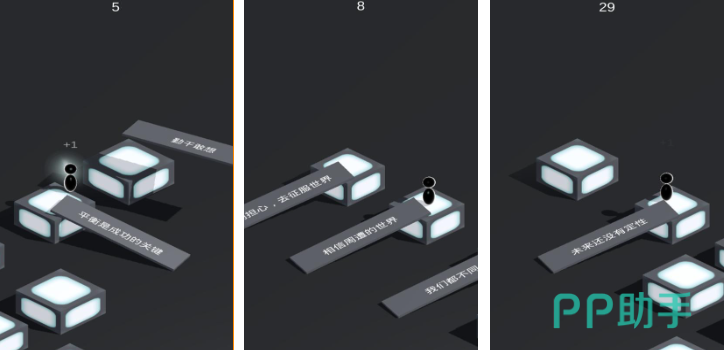 以极简抽象美学构建的跳一跳游戏,主角为几何化方块小人,场景设定于漂浮于海面的不规则平台之间。画面留白充足,配色克制,强调跳跃落点预判与心理节奏把控。高难度关卡设计强化挑战性,适合追求纯粹操作精度与视觉静谧感的玩家群体。