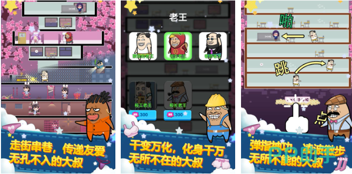 主打轻松幽默风格的跳一跳作品,主角为拟人化中年男性角色,配备多套可更换服饰皮肤。操作响应灵敏,跳跃弧线自然,背景采用萌系卡通渲染,配合恰到好处的音效反馈,营造出松弛愉悦的游戏氛围。节奏舒缓但不失变化,适合作为日常解压小憩之选。