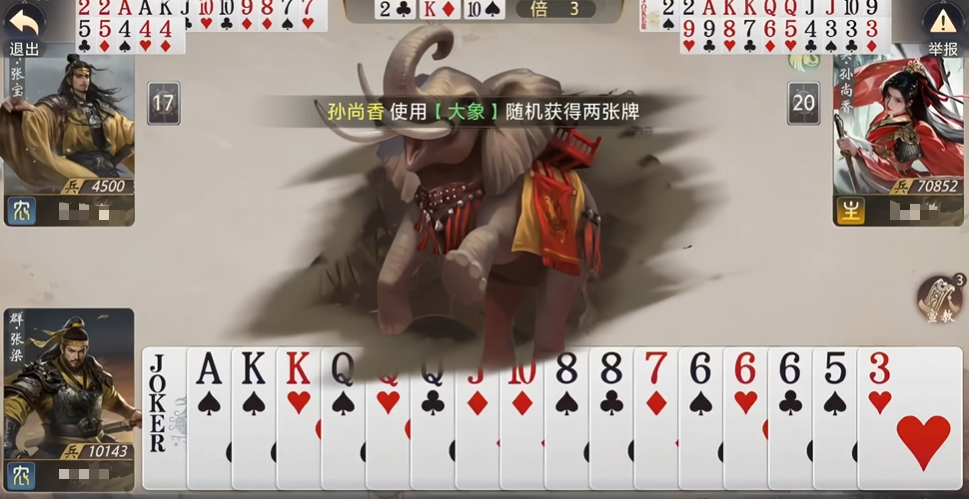 其五为大象,技能在准备阶段自动触发:随机补充两张手牌。该效果不可控,可能形成高价值组合(如炸弹、关键单牌),也可能仅得两张零散单张,属于高风险高回报型坐骑,适合擅长动态调整策略的进阶玩家。