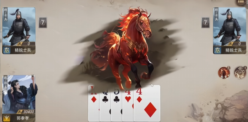 其三为赤兔,技能限定为:打出五张连续点数的顺子时,仅需消耗四张牌即可完成出牌。该效果不可用于其他长度顺子或非顺子牌型,但与关羽“武圣”技能联动性极强,是构建快攻体系的关键组件。