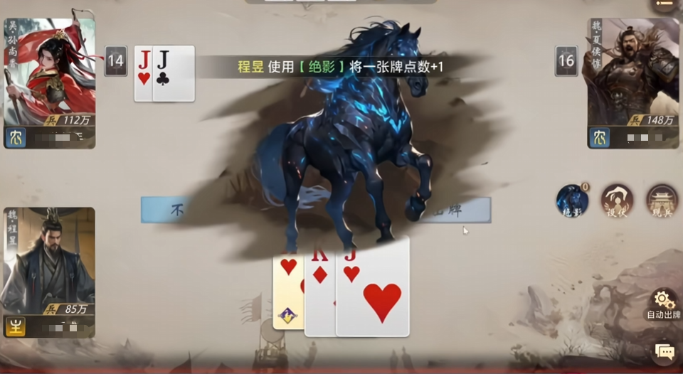 其二为绝影,技能为:选定一张手牌,将其点数+1(如K变为A)。需特别注意——经此调整后的牌无法参与构成任何类型炸弹(含四张相同点数、万能牌组合、马超“铁骑”触发条件等),且与拥有标记类技能的武将存在适配限制,使用前务必评估当前手牌结构与对手动向。