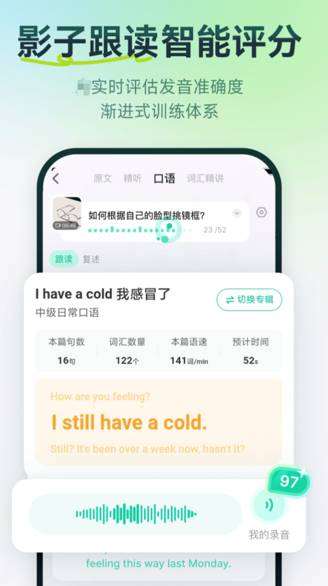 针对“听得懂但说不出”这一典型问题,产品将听力与口语能力拆解为六大训练模块:泛听、精听、跟读、复述、影子跟读、角色对话。每个模块既可独立使用,又能形成闭环训练流。独创“刮刮卡”提示机制,在句子卡顿时提供关键词或语法线索,保留思考空间而不打断学习节奏。中英双语字幕支持实时切换,满足不同阶段需求;精听模式专注细节捕捉,泛听模式侧重信息整合,兼顾日常提升与应试强化。