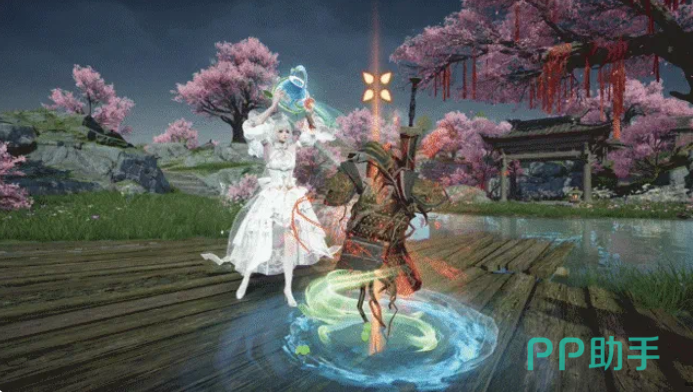 表情动作【洛天依·星光律动】包含完整舞台演出流程:角色立于繁花簇拥的幻境花台之上,抬手挥动启动应援信号,随即放声高歌;救援特效中,角色高举绘有铃兰图案的幻彩水壶,倾泻青碧水流,水面瞬间催生藤蔓急速延展。