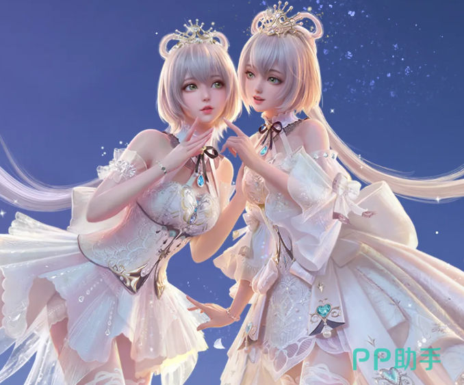 配套发型延续洛天依经典视觉符号——无限形蝶翼环尾造型,发色为高光银白,质感柔亮顺滑;齐刘海与侧分发束共同塑造清新软萌轮廓;发饰采用蝴蝶意象金饰,蓝钻镶嵌件随光线角度变化呈现动态折射;顶部配透白薄纱,缀以碎钻与精细暗纹,在不同光照条件下展现层次丰富的梦幻光泽。
