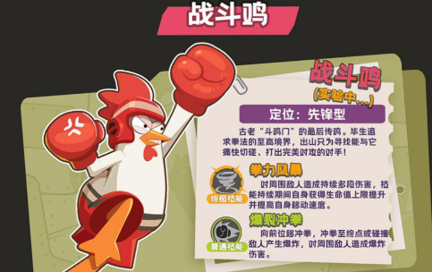 最后就是战斗鸡,这就是一个先锋突袭的狠角色。主要是以高强度近身压制为主,比较适合敢打敢冲的进阶玩家。普通技能爆裂冲拳就可以直线突进,冲到终点或者是撞到敌人之后就会爆发爆炸。一下子就可以直接拉开敌人的防线,另外终极技能拳力风暴开启后,对着周围的敌人一顿连续打击,在技能持续期间就可以迅速的提升移动速度,还有血量上限。确实是越打越猛。不过他比较怕远程火力压制,所以玩家一定要注重走位的预判,还有切入的时机,用好地形,找准机会。