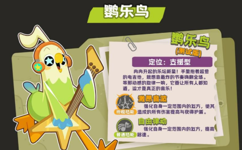 鹦乐鸟这就是团队中不可以缺少的辅助担当。作为一个乐坛的新星,并不是靠直接杀敌制胜,而是用旋律给队友去加持。普通技能自由律动在开启之后,范围内的队友移动速度就会直接提升,不管是迅速的调整阵型,还是拉扯打游击,都能让团队的操作更加的灵活。终极技能就成为团战的神器,可以让范围内队友的伤害大幅度的提升,还可以给大家套一个临时护盾。在提升爆发的同时还能有效增加生存力,虽然说它的自身防御比较弱,但确实比较考验玩家的战场视野。