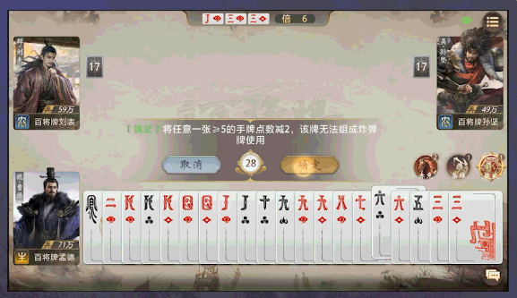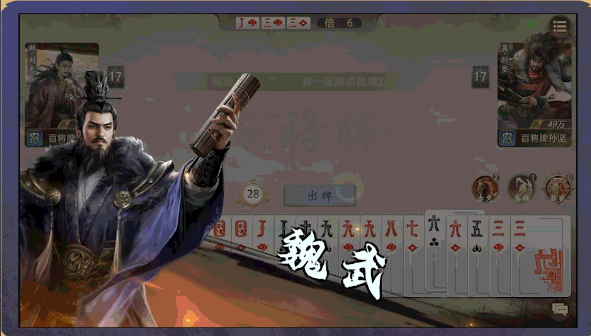 在这款游戏中,曹操是很多人都知道的角色,他的打法没有固定套路,玩家可以根据场上的情况调整手里的牌。他的技能之间能配合使用,打出不一样的效果,操作时要合理运用技能,改变自己的出牌节奏。我们可以用技能引导对方行动,再找机会限制对手。我们先来看一下曹操的魏武技能,能自己动手改手里牌的大小,挑一张牌把点数往下调2点,这样能凑出飞机和连队这种牌型,就像把Q改成10,再和别的牌搭在一起,能顺起来,也能凑成炸。